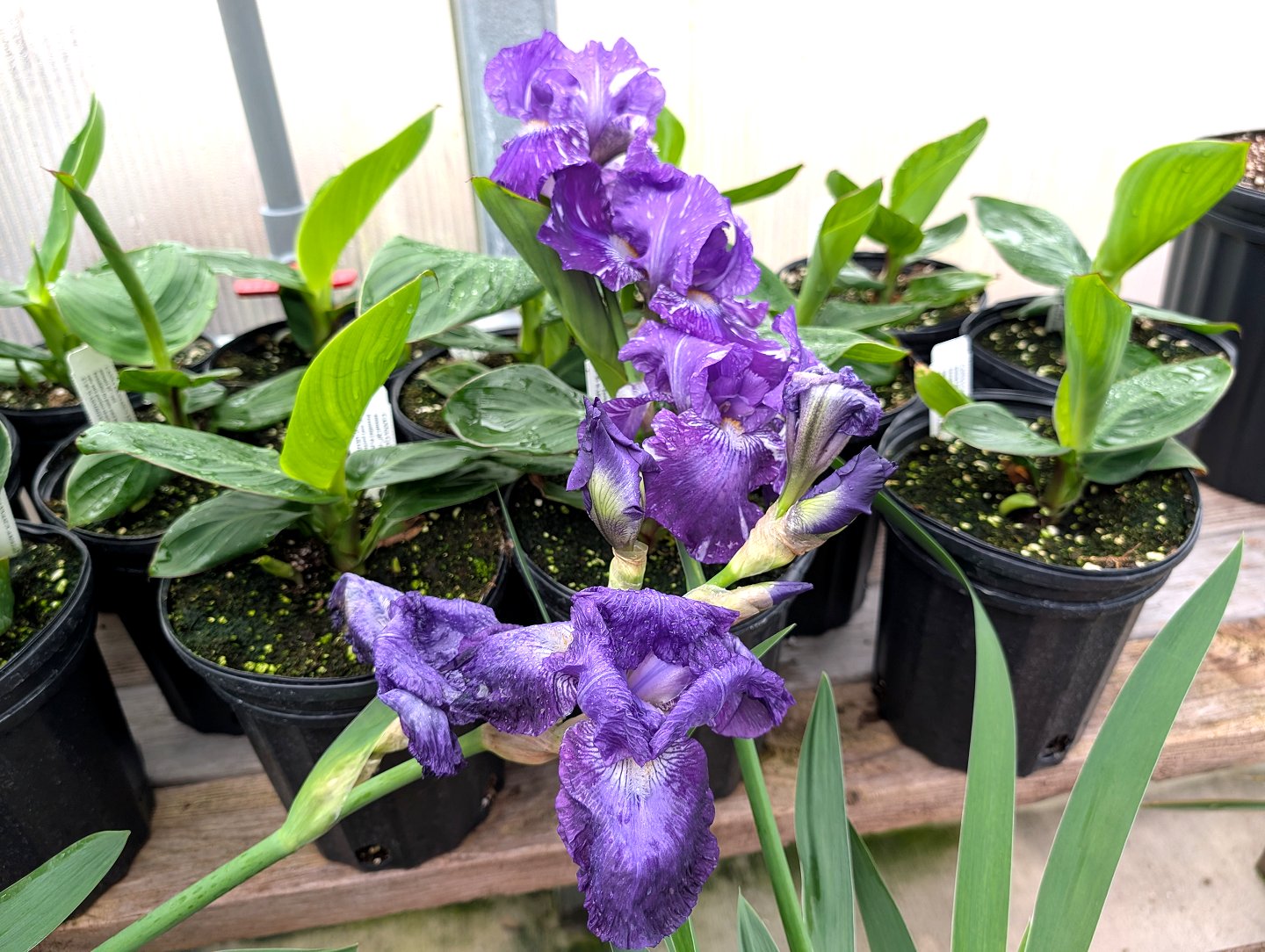 We received a lot of Iris tagged Germanica Batik. There are solid purple, purple with white spots and another color two. They are in full bloom now so you will see the color. Regularly $17.99 now only $14.99.
